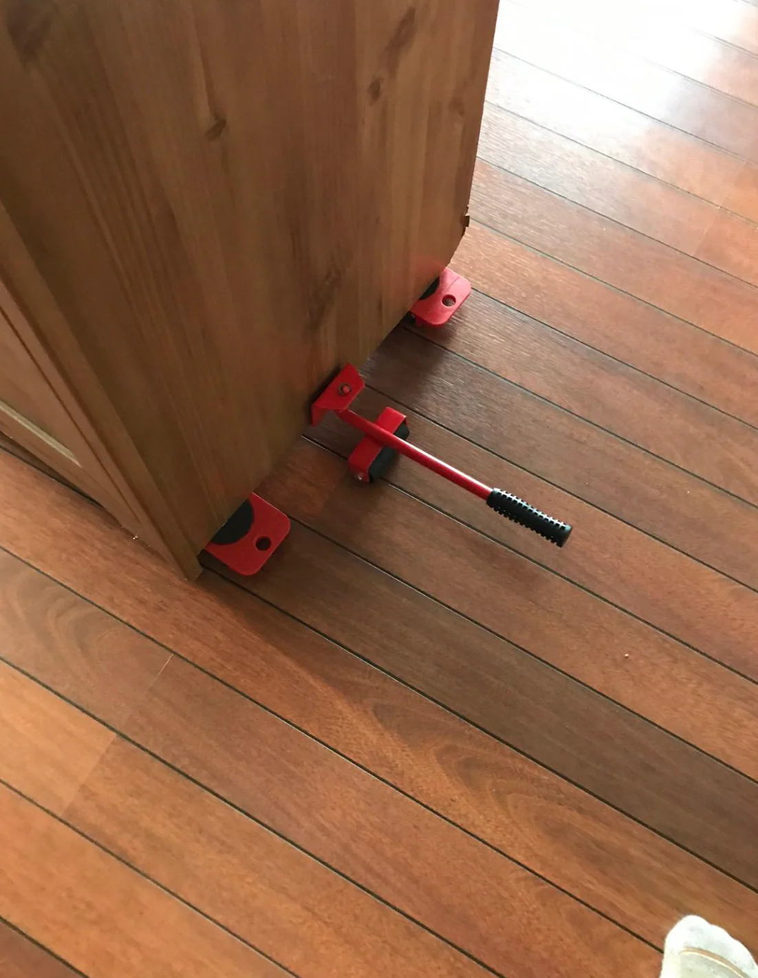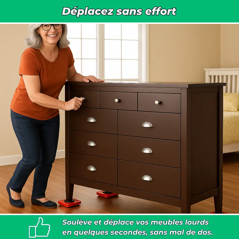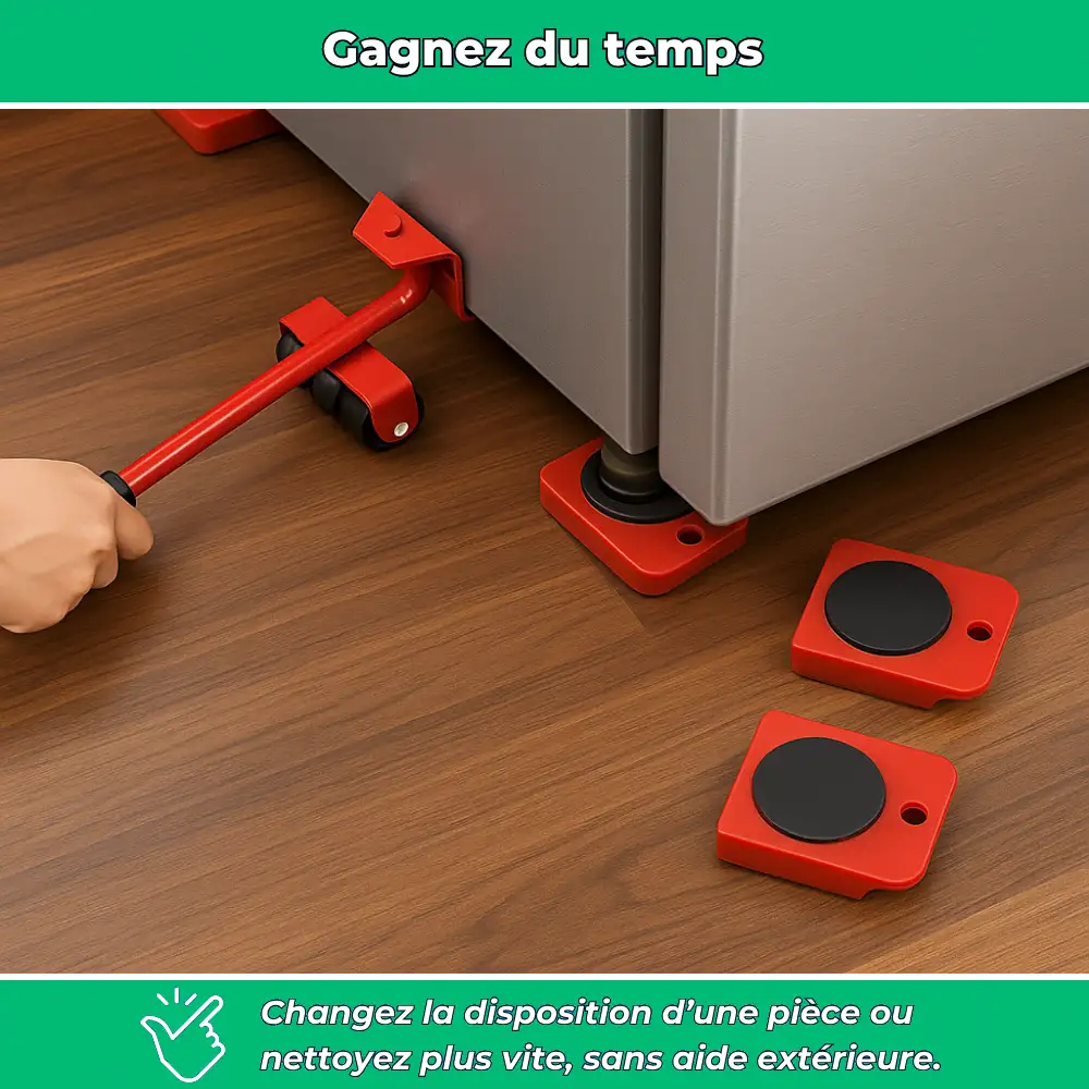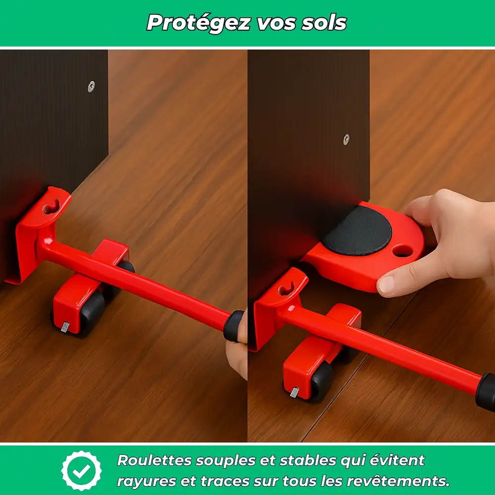 Avant, le mal de dos et les efforts inutiles pour déplacer un meuble. Après, un simple levier, des patins à roulettes ultra solides, et c’est réglé ! Gagnez du temps, protégez votre santé et vos sols. Le kit s’installe en quelques secondes, sans outil.
